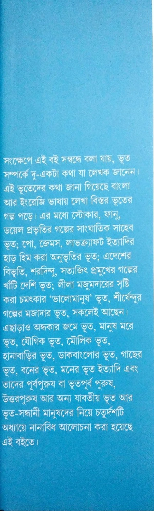 ভূতকে যাঁরা কুসংস্কার বা অবাস্তব বিষয় হিসেবে উড়িয়ে দেন, এই বইতে তাঁদের জন্য বিশেষ খোরাক আশা না করাই ভালো। ভূত আছে কি নেই, সেই তর্ক এখানে উত্থাপিত হয়নি। ভূতের গল্পের চরিত্ররা এই প্রসঙ্গে কেমন মত পোষণ করে, বা লেখকরা কী ভাবেন, তার খানিক খোঁজখবর করা হয়েছে। ভূতের অস্তিত্ব বা অনস্তিত্ব এই বইয়ের প্রতিপাদ্য বিষয় নয়। ভূতেদের উপর নির্ভর করে রচিত সাহিত্যের ধাঁচ কেমন হয়, বা আগে কেমন হত, কিংবা ভবিষ্যতে কেমন হতে পারে; এবং ভূতের গল্প পড়ে পাঠকের কীভাবে, কত দূর আনন্দ পাওয়া সম্ভব, সেই সম্পর্কে অনুসন্ধানের চেষ্টা করা হয়েছে। তাই ভূত-বেরসিকদের আগে থাকতে সাবধান করা থাকল। যদি তেমন কেউ এই বই পড়ে ফেলে ভূত-রসিক হয়ে ওঠেন, তার দায় লেখকের রইল না।